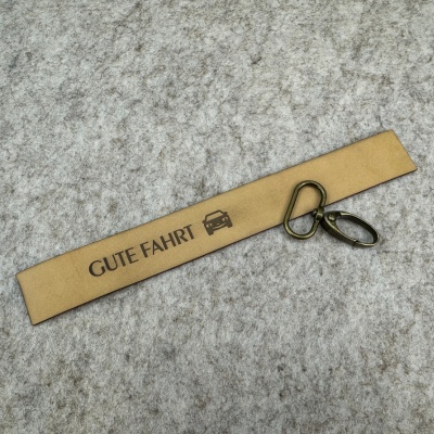 Ein selbstgefertigter Schlüsselanhänger aus hochwertigem Leder mit Gravur ist mehr als nur ein praktisches Accessoire. Er vereint Stil, Qualität und Persönlichkeit. Mit einem lasergravierten Schriftzug wie „Gute Fahrt“, wird der Anhänger im Handumdrehen zum charmanten Glücksbringer für unterwegs. Über unseren Konfigurator kannst du deine Lederauswahl treffen und Größe, Text sowie Schriftart selbst bestimmen. Es stehen dir auch zahlreiche Symbole für dein individuelles Design zur Verfügung.