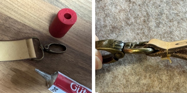 Wenn du dein Wunschlabel erhalten hast, lege es in den Karabinerhaken, sodass Ende und Anfang des Lederlabels unterhalb des Karabinerhakens übereinanderliegen. Wenn alles passt, klebe das Leder fest, damit später beim Nähen nichts verrutscht.