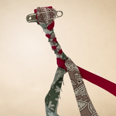 Fixiere die drei Stoffstreifen mit einer Sicherheitsnadel. Damit du besser flechten kannst, stelle etwas Schweres auf den Anfang der Streifen oder klebe ihn mit einem Klebeband auf deinem Tisch fest.
