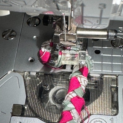 Sobald du mit dem Flechten fertig bist, sichere das Ende der Streifen, indem du mit der Nähmaschine drübernähst. Das gleiche machst du auch mit dem Anfang, damit sich nichts lösen kann.