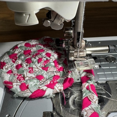 Beginne in der Mitte und nähe in kreisförmigen Bahnen zwischen den geflochtenen Strängen entlang. Drehe dein Nähstück dabei Stück für Stück weiter. Halte zwischendurch ruhig an – lasse dabei die Nadel im Stoff – so kannst du dein Werk jederzeit neu ausrichten und sauber weiterarbeiten.