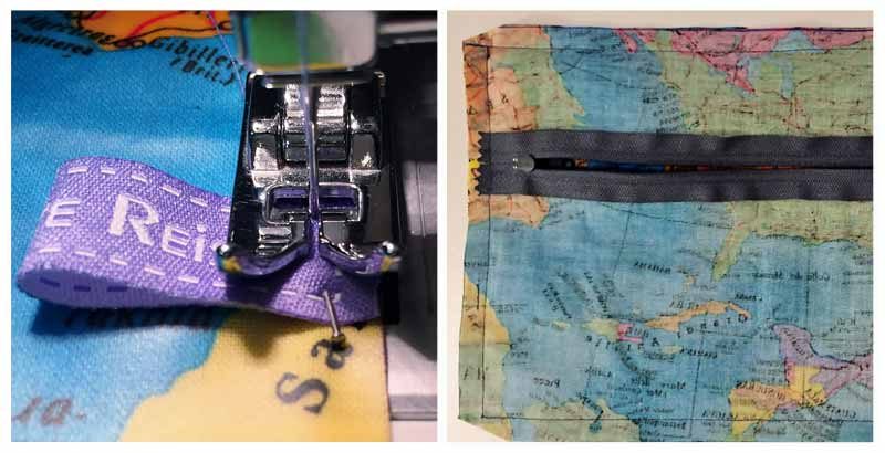 Mit einem Reißverschlussfuß auf der rechten Stoffseite (Oberseite) festnähen. Damit der Schieber des Reißverschlusses beim Nähen nicht im Weg ist, den Reißverschluss öffnen. Am Ende den Reißverschlussfuß anheben und den Reißverschluss wieder schließen.  Die Nähnadel bleibt dabei im Stoff und der Schieber wird am Reißverschlussfuß vorbeigezogen. Bei Bedarf den Stoff unter der Nadel etwas drehen.