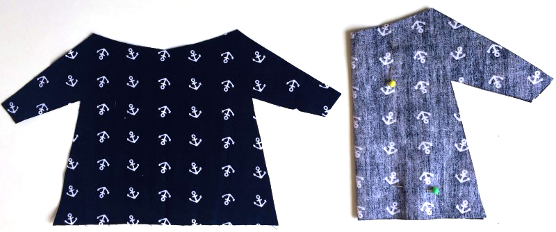 Die Nahtzugabe von 1 cm bereits enthalten. Das Schnittmuster dabei am Stoffbruch anlegen: der Stoff wird dafür mittig gefaltet und aufeinander gesteckt, anschließend ausschneiden. Nach dem Zuschnitt auseinander falten. Auf diese Weise ein Vorder- und ein Rückteil zuschneiden.