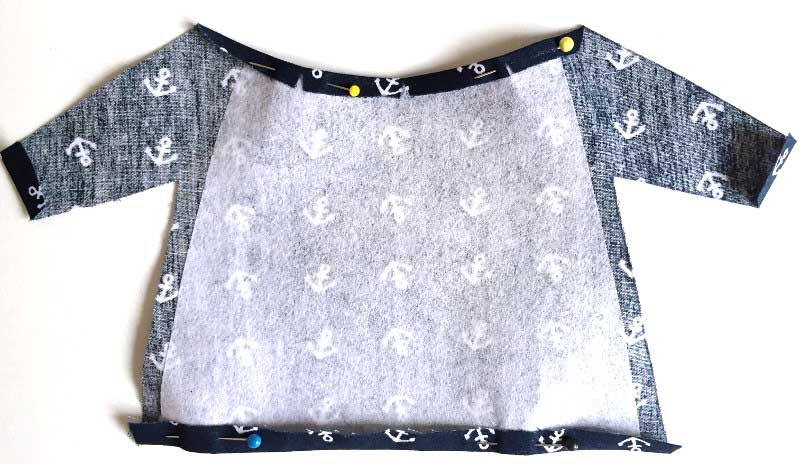 - Zum Verstärken der Stoffteile wird auf die Innenseite Vieseline aufgebügelt. Diese wird etwas kleiner als die Stoffe zugeschnitten. Die Arme werden nicht verstärkt, um sie später besser wenden zu können.